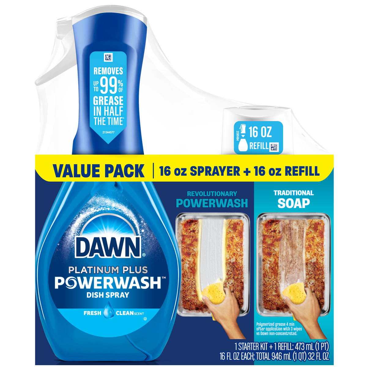 Dawn Powerwash Dish Spray removes 99% of grease and grime in half the time*. Powerwash has 3 cleaning boosters not found in traditional dish soaps that remove food and grease 5X faster*. And because it cleans so well, you can replace multiple cleaning products around your home for counters, stoves, grills, and stains on laundry. Powerwash delivers the power of an overnight soak in minutes. For everyday messes, just spray the suds on and wipe, no water needed until rinsing. For tougher messes, let the suds sit a few minutes before wiping. Save money and reduce waste by reusing your sprayer. Convenient refills available in a variety of scents.